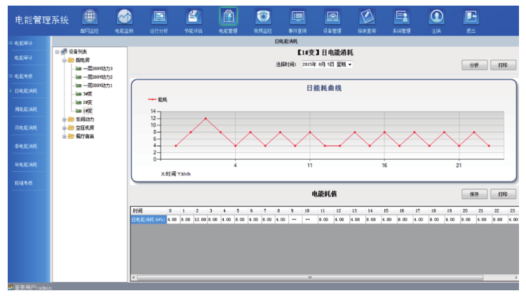 电能考核:为管理者提供设备日、周、月、季、年的电能消耗报告,报告以曲线、表格的形式展示,为电能管理者分析设备配电网络消耗的运行情况,了解设备的能耗状况